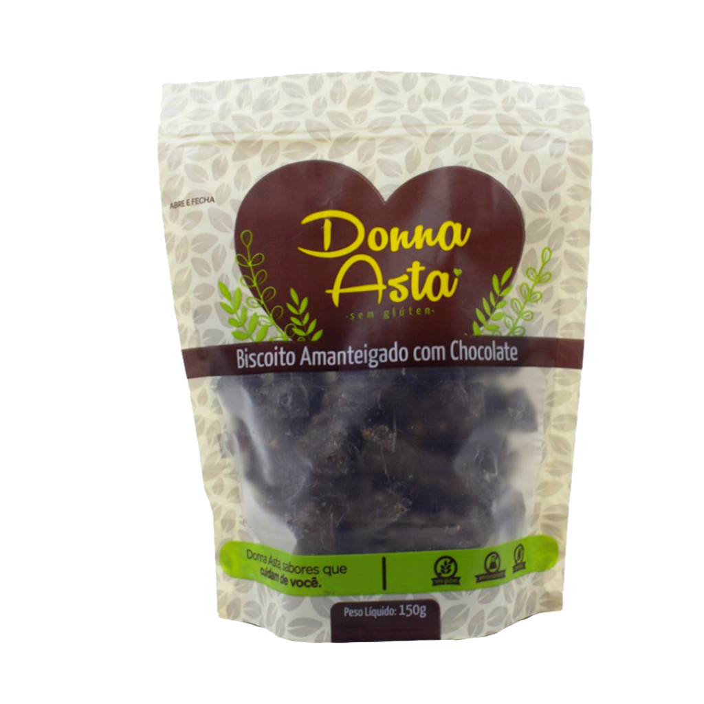 Ingredientes: Farinha de arroz, fécula de mandioca, açúcar mascavo, gordura vegetal, ovos, cobertura de chocolate meio amargo (açúcar, cacau em pó, gordura vegetal, emulsificantes lecitina de soja e polirricinoleato de poliglicerol e aromatizante), açúcar de baunilha e fermento químico (amido de milho, pirofosfato ácido de sódio, bicarbonato de sódio, fosfato monocálcico e antiumectante dióxido de silício).