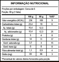 Mistura de panetone (farinha de arroz modificado, amido, fécula de mandioca, açúcar, fibra de beterraba, psyllium, fermento químico — bicarbonato de sódio e pirofosfato de sódio, espessantes — carboximetilcelulose e goma xantana, emulsificante — estearoil lactil lactato de sódio, e aromatizantes), ovos, chocolate sem lactose e óleo de milho.